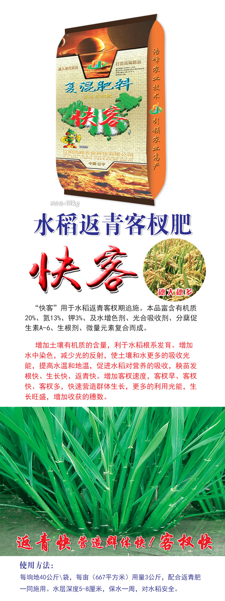 “快客”用于水稻返青客杈期追施。本品富含有機質(zhì)20%、氮13%、鉀3%、及水增色劑、光合吸收劑、分蘗促生素A-6、生根劑、微量元素復(fù)合而成。