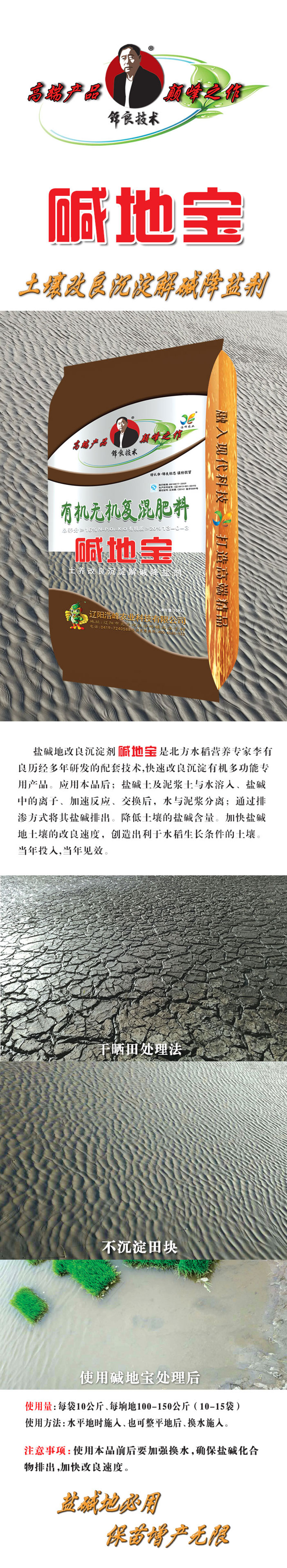鹽堿地改良沉淀劑是北方水稻營養(yǎng)專家李有良歷經(jīng)多年研發(fā)的配套技術,快速改良沉淀有機多功能專用產(chǎn)品。應用本品后;鹽堿土及泥漿土與水溶入、鹽堿中的離子、加速反應、交換后,水與泥漿分離;通過排滲方式將其鹽堿排出。降低土壤的鹽堿含量。加快鹽堿地土壤的改良速度,創(chuàng)造出利于水稻生長條件的土壤。當年投入,當年見效。